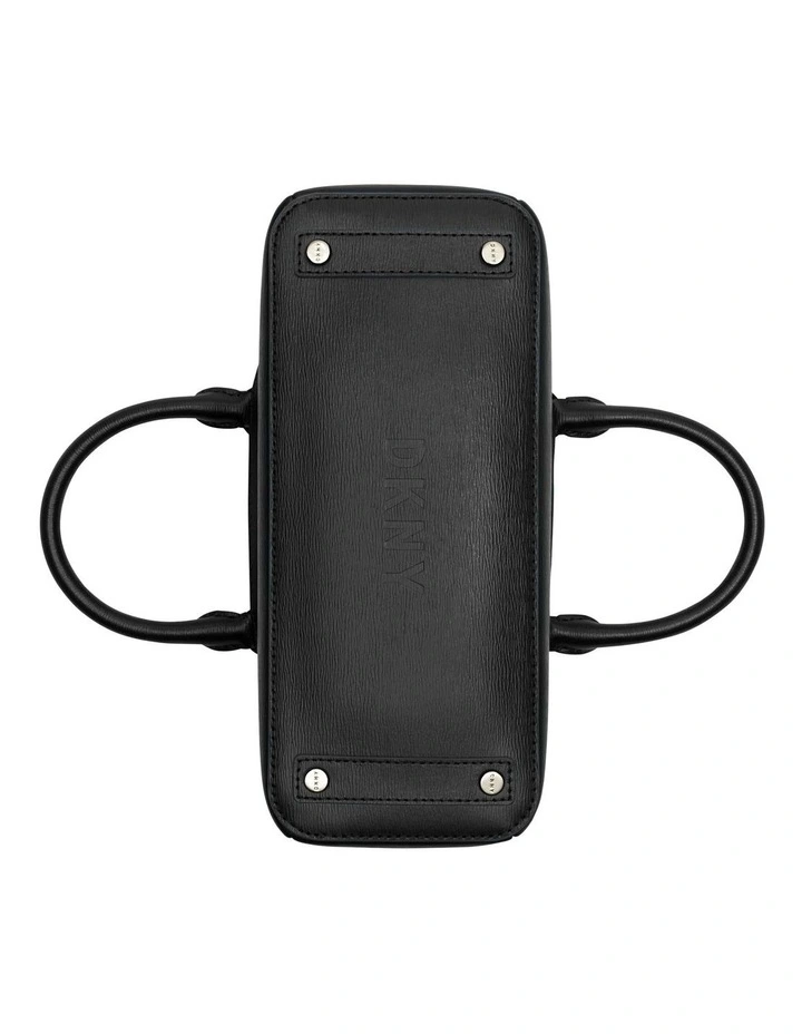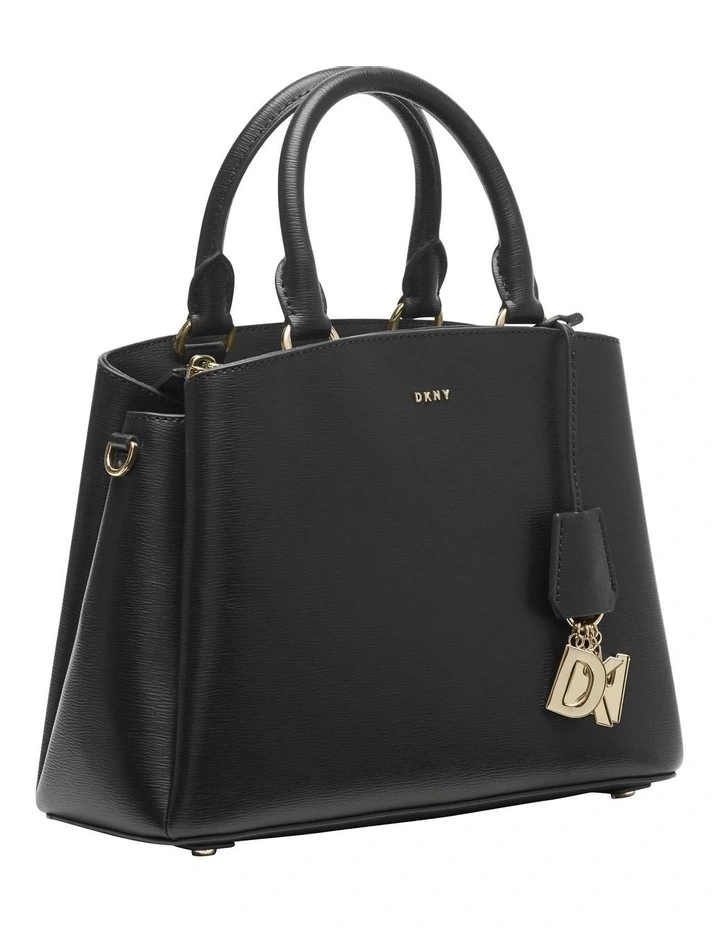 Triple compartment textured leather satchel with dual rolled handles featuring DKNY logo charm accent and rear exterior zip pocket.Β Also includes optional, adjustable shoulder strap.