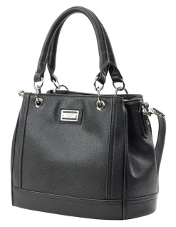 The Atene Mini Satchel from GUESS is inspired by preppy style and luxury vibes. Featuring an adjustable strap and a secure top handle, this marvelous mini will take you from the office to a night out. Embellished with an antique bronze lock detail and made with charcoal logo vegan leather, this timeless piece