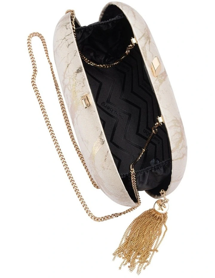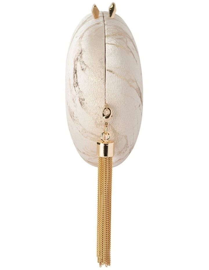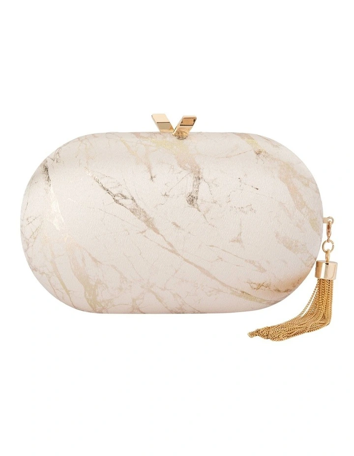 The TRINNA Jacquard Clutch with tassel features a marble effect finish, a sleek oval body and an optional metal chain tassel making it the perfect choice for a formal event.