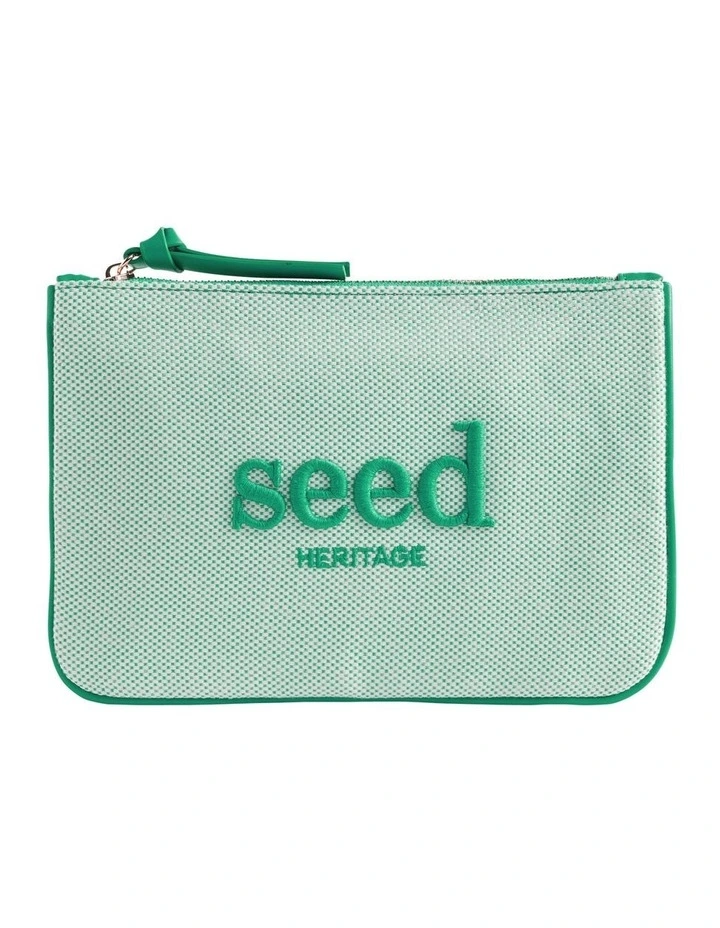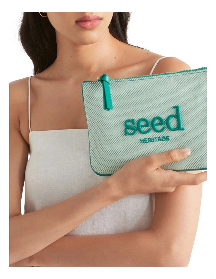 This textured pouch is the perfect size, compact but big enough for all your essentials. The woven material is designed with an embroidered Seed Heritage logo and the pouch has a zipper opening.