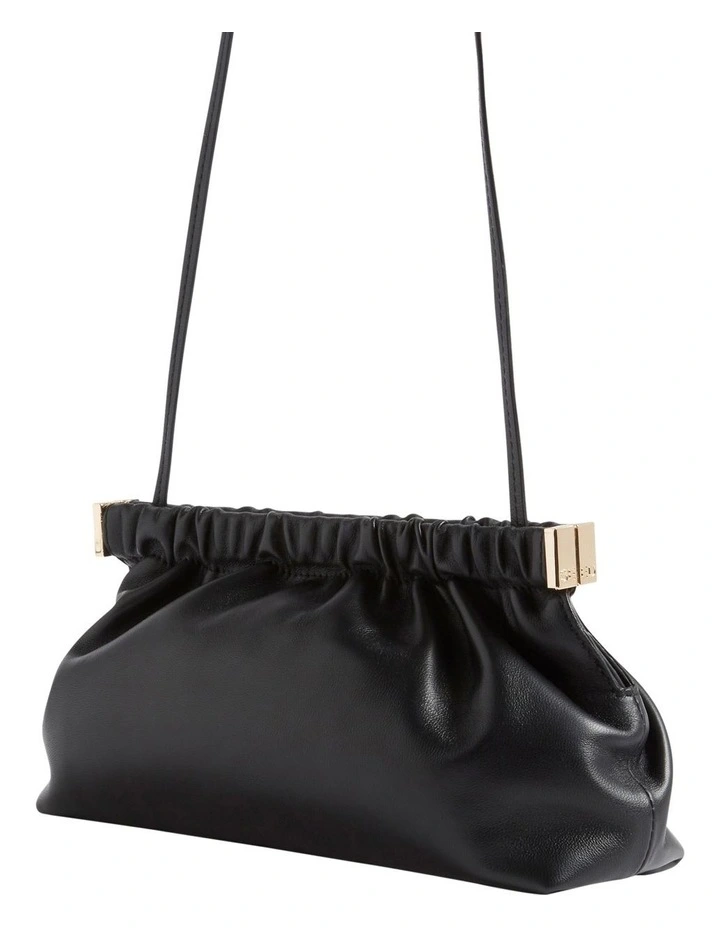 This soft leather clutch features a metal frame and magnetic closure. With a modern, gathered look, it is the ideal companion piece for your evening outfits.