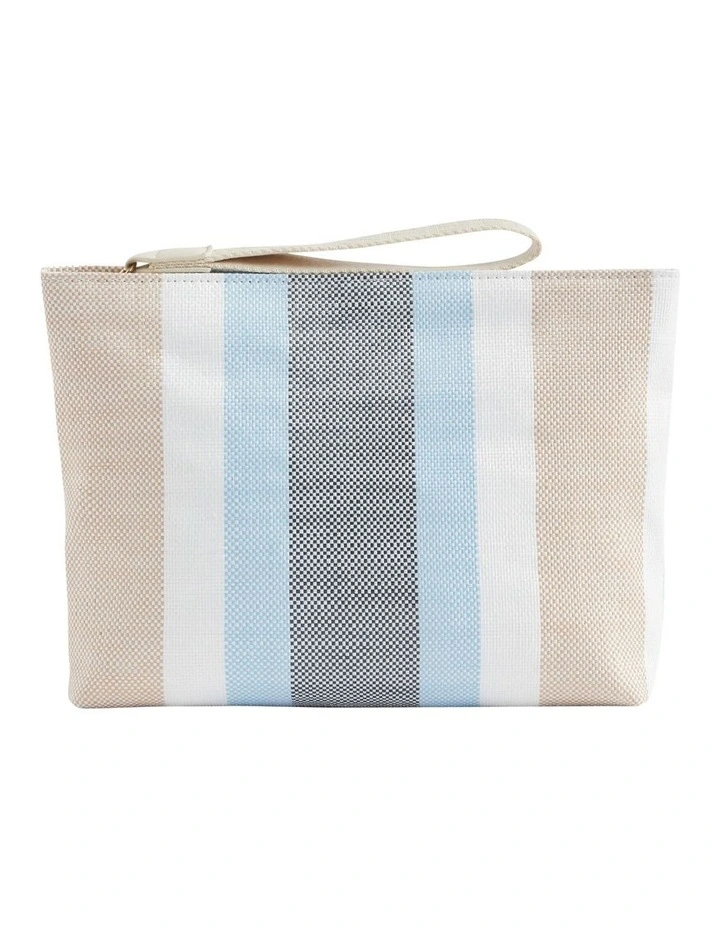 With a bright, modern stripe pattern, this pouch is the casual piece your summer wardrobe needs. It closes with a zip, and features a wrist strap decorated with the Seed Heritage logo.